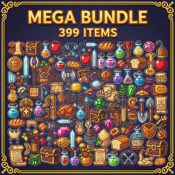 ALL 399 RPG item sprites in one massive bundle! Weapons, armor, potions, gems, scrolls, keys, food, tools, crafting materials, treasure, and more. Everything you need for a complete RPG item system. 32x32 pixel art, transparent backgrounds. Save 33% vs buying volumes separately. Compatible with Unity, Godot, GameMaker, RPG Maker, Construct 3.